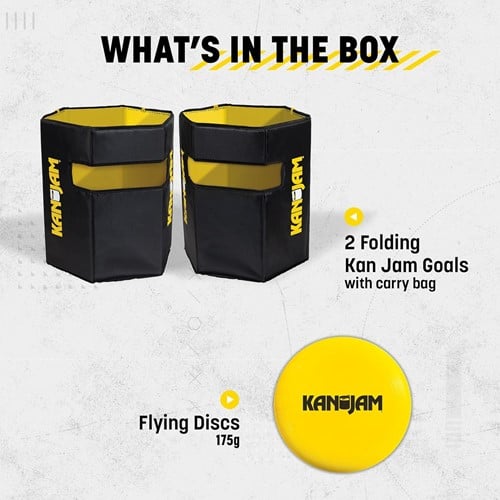 2 x Kan zum Falten Höhe ca. 50 cm, ø ca. 43 cm. 1 x Offizielle KanJam Disc 1x Spielanleitung